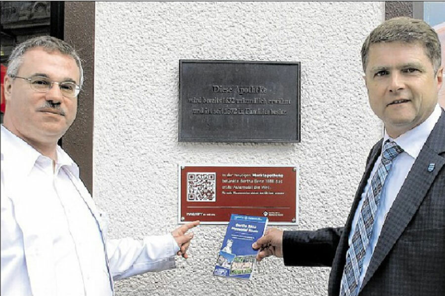 An diese authentische Route erinnert die in Emmendingen beheimatete Firma Maqnify mit Plaketten, die mit „QR Code“ ausgestattet, auch Mobiltelefonnutzern Informationen bieten. Eine dieser Plaketten prangt seit gestern an der 1632 erstmals erwähnten Marktapotheke, die laut Apotheker Gebhard Walter Nagel seit 1872 in Familienbesitz ist. Gesponsert wird die Aktion übrigens von den Stadtwerken Bretten.