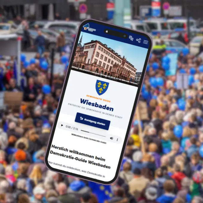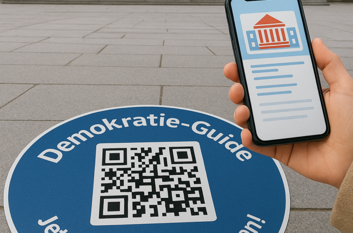 Über hochwertige Fußbodenaufkleber mit QR Codes an individuell ausgewählten Demokratie Orten in deiner Kommune werden die Menschen direkt in den Guide geführt – ganz ohne zusätzlichen App-Download. Durch Audio-Storytelling und Bilder, Rundwegeanzeigen und spielerische Elemente entsteht ein emotionales und unmittelbares Verständnis dafür, wie Demokratie funktioniert – und warum sie uns alle betrifft.