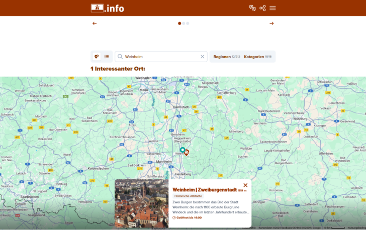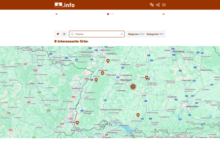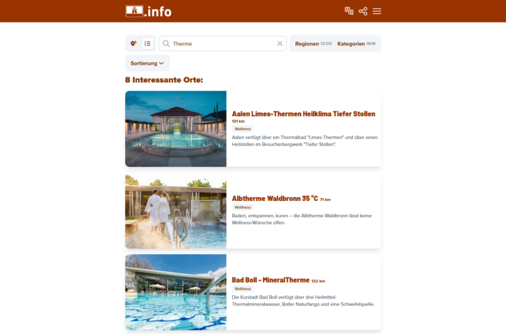 Frontendseitig wird dann ein Freitext-Suchfeld oberhalb der Karte angezeigt. Kann der eingegebene Suchbegriff einem POI zugeordnet werden, so zoomt der Kartenausschnitt automatisch heran. Parallel aktualisiert sich die Listenansicht. Zusätzlich kann die Suche durch Nutzung der Kategorie sowie -falls vorhanden- der Regionsfilter eingegrenzt werden. Der Nutzer kann nun entweder auf den Eintrag in der Liste, oder die Teaser-Kachel in der Karte klicken, um zum gesuchten POI zu gelangen.