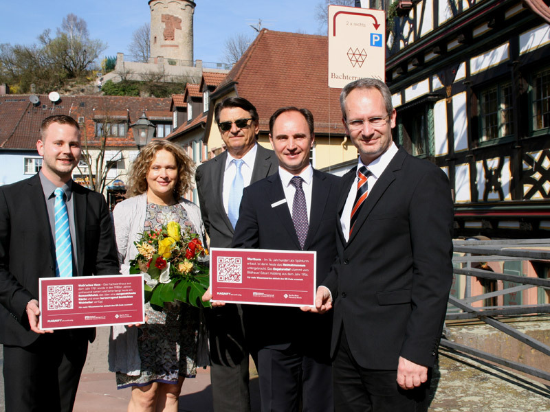 Die Bertha-Benz-Memorial-Route ist das erste Projekt. 18 Gemeinden haben sich der Strategie bereits angeschlossen und erhalten derartige Tafeln mit QR-Codes. Und Weingarten ist dabei. Jetzt suchte Fischer Weingartens Bürgermeister Eric Bänziger in seinem Büro auf und brachte ihm zwei Schilder mit einem „Cr-Code“. Eines dieser Schilder wird am Walkschen Haus angebracht, das andere am Wartturm.