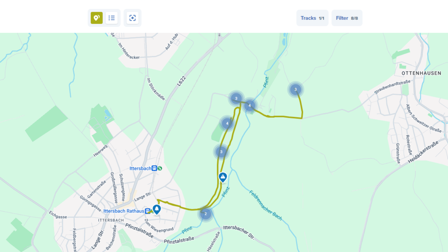 Im Frontend sind die Strecken automatisch auf der Karte aktiviert und können vom Nutzer per Filterauswahl ein- oder ausgeblendet werden. Um eine Unterscheidung von sich überlappenden Routen zu ermöglichen, werden die jeweiligen Wegstrecken automatisch in unterschiedlichen Farben angezeigt.