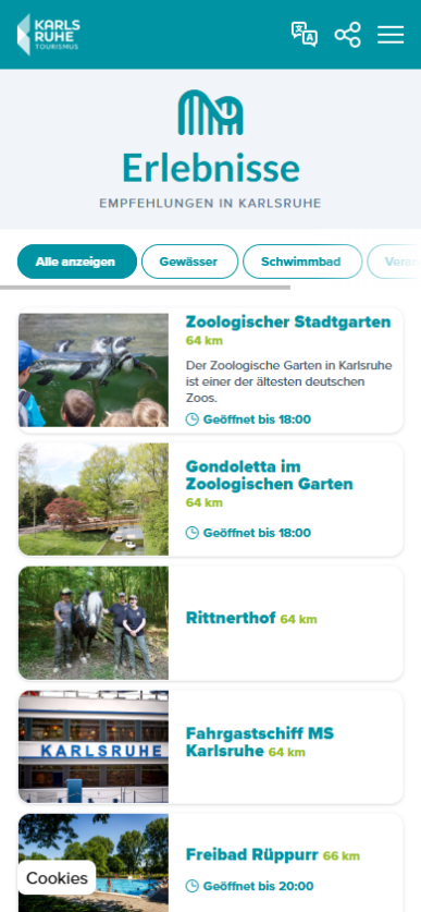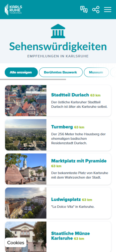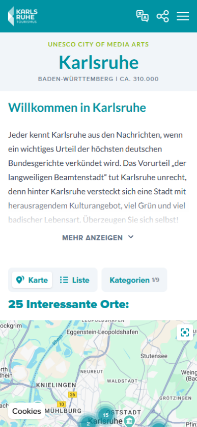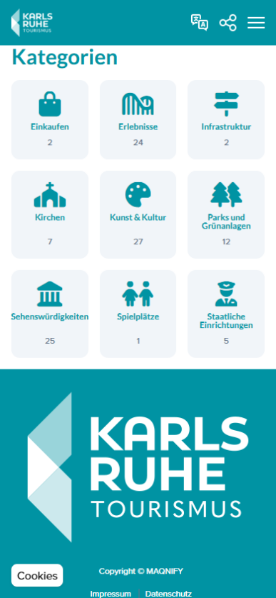 Integraler Bestandteil der innovativen Software-Lösung auf den Stelen unseres Partners netvico GmbH aus Stuttgart, war die Einführung eines webbasierten digitalen Besucherleitsystems. Dieses wurde auf Basis des MAQNIFY© Guide umgesetzt, um primär touristischen Gästen eine bessere Orientierung innerhalb der Kernstadt sowie in den Ortsteilen Durlach, Rüppurr u.a. zu ermöglichen. Dabei sollen einerseits touristische POI hervorgehoben werden, um den Besuch und die Erkundung der Region zu erleichtern, andererseits lag der Fokus auf Erlebnissen, ergo buchbaren Angeboten und aktuellen Veranstaltungen in der Umgebung.