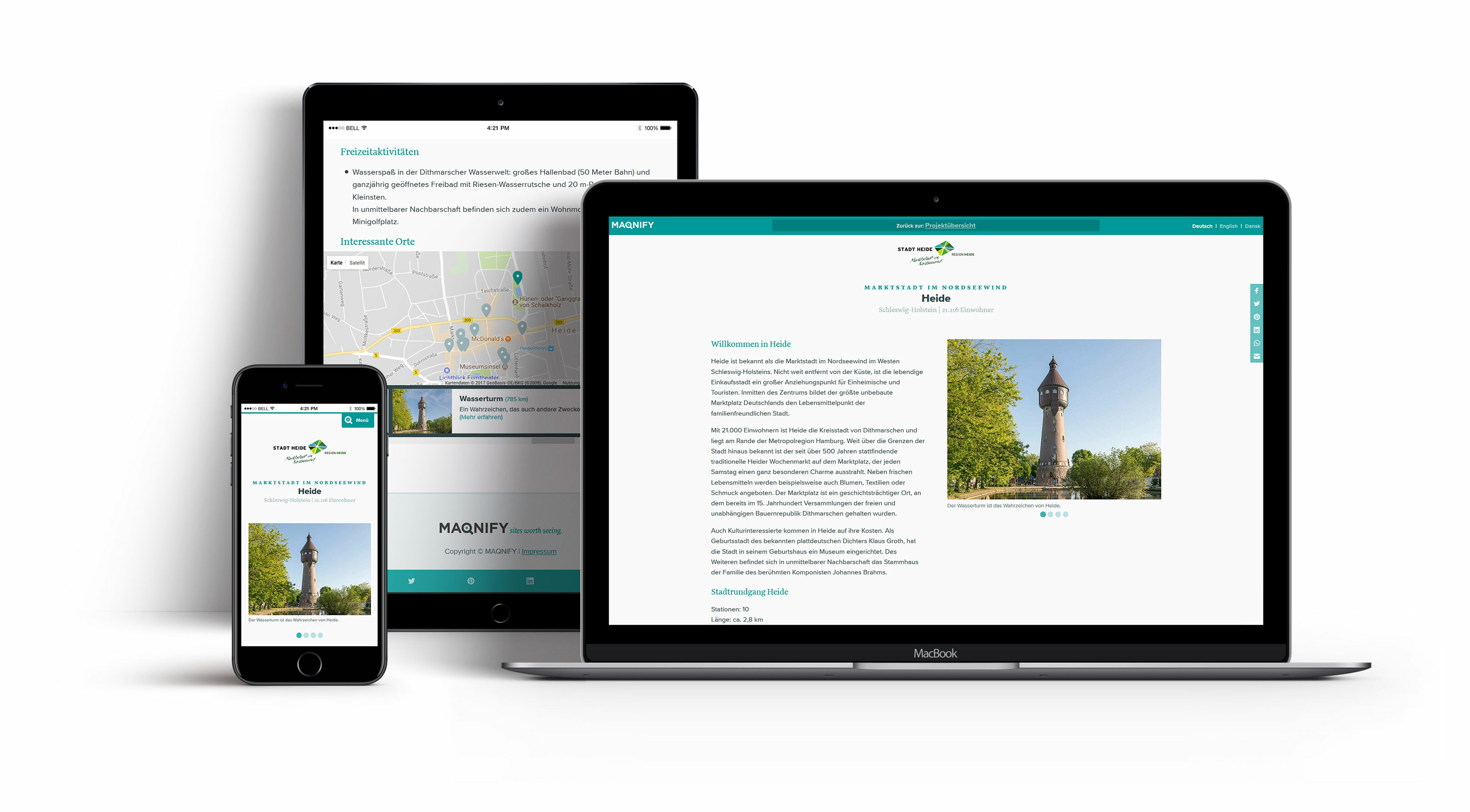 Ziel der Stadt Heide war es, ein digitales touristisches Angebot zu schaffen, welches die Sehenswürdigkeiten und das kulturelle Angebot der Stadt Heide erlebbar macht. Gemeinsam mit MAQNIFY wurde ein Rundweg mit 10 Stationen konzipiert, der sowohl die Tourist-Information als Ausgangspunkt hat, als auch von jeder Station einen individuellen Einstieg in einen Rundweg ermöglicht. Um auch internationale Besucher in Heide zu informieren wurde der Rundgang auf Deutsch, Englisch und Dänisch angelegt. Dadurch wird auch die besondere Verbundenheit mit den dänischen Partnern und die Wertschätzung der regelmäßigen dänischen Besucher zum Ausdruck gebracht.