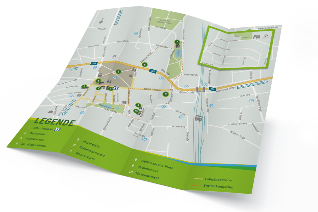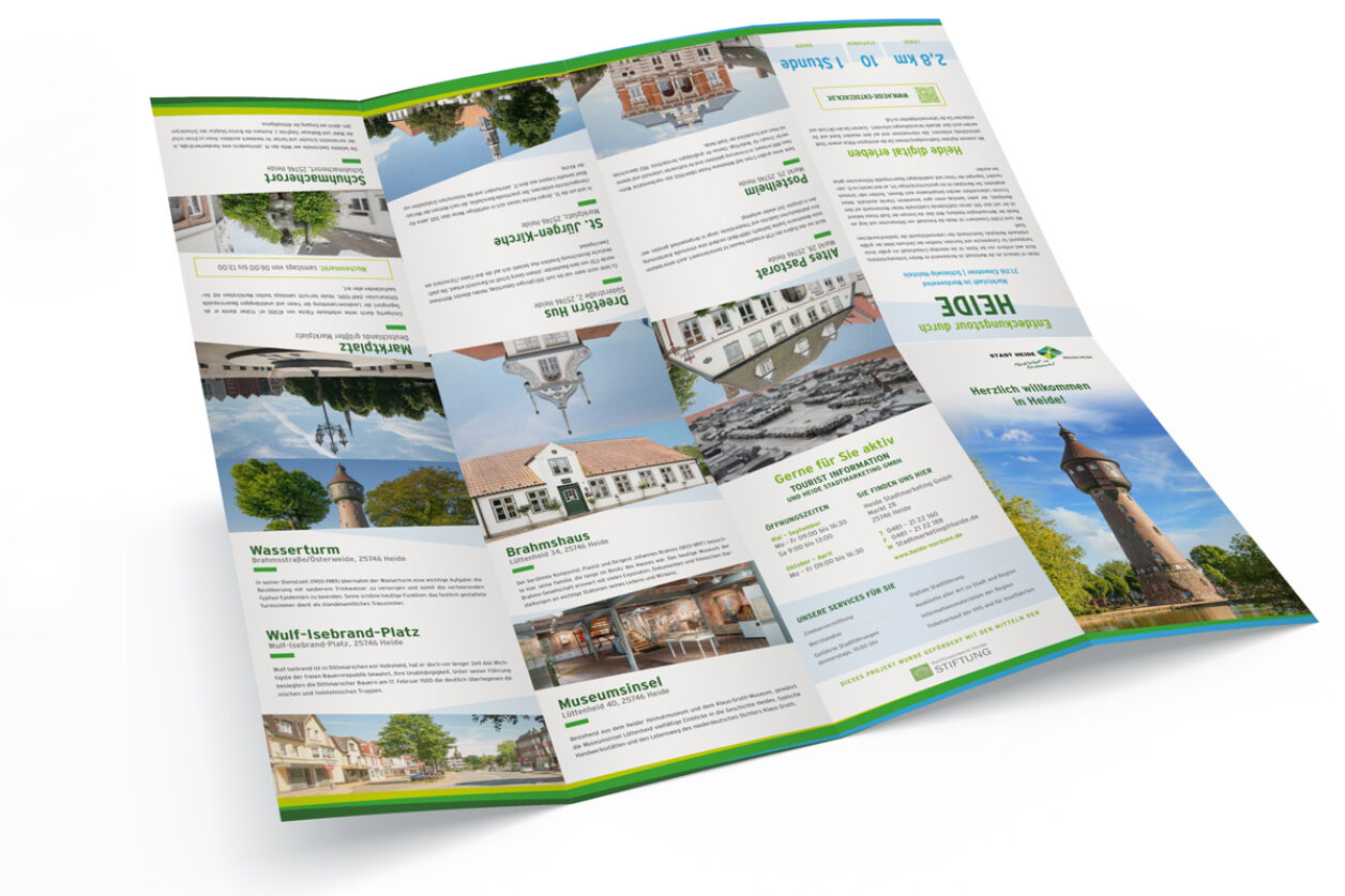 Weiterhin wurde eine neue Broschüre in der CI von Heide entwickelt, mit der Besucher den Rundweg erkunden können. Die Broschüre besteht aus einer Übersichtskarte mit allen wichtigen Punkten in der Stadt und einem Informationsteil, der die einzelnen Stationen in kürze erklärt. Zusätzlich wurde ein Aufkleber-Set in zwei Größen entwickelt. Die Aufkleber werden u.a. an den öffentlichen Parkscheinautomaten, Geldautomaten, der lokalen Gastronomie und bei Geschäften verteilt. Durch eine Vielzahl von Berührungspunkten im gesamten Stadtgebiet sorgt der Rundgang auch offline für Aufsehen und lädt Einheimische und Besucher gleichermaßen dazu ein die Stadt Heide bei einem gemütlichen Spaziergang näher kennenzulernen.